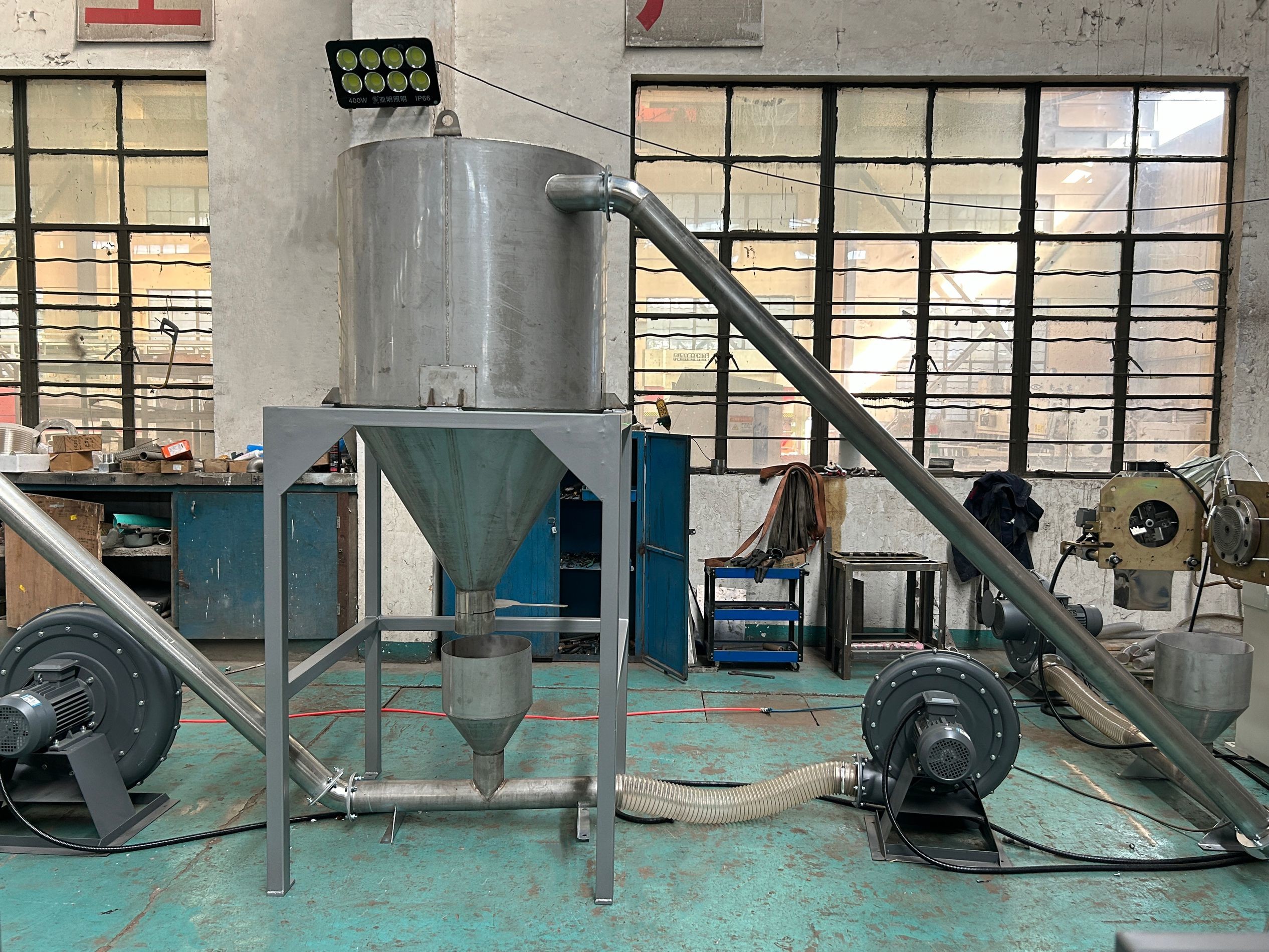 Raw material+ additive → Mixing → Conveying feeding → hopper feeding → Conical twin screw extruder → Hot face cutting → Cyclone separator → Vibration sieve → Blowing system → Storage hopper → Finished product packing