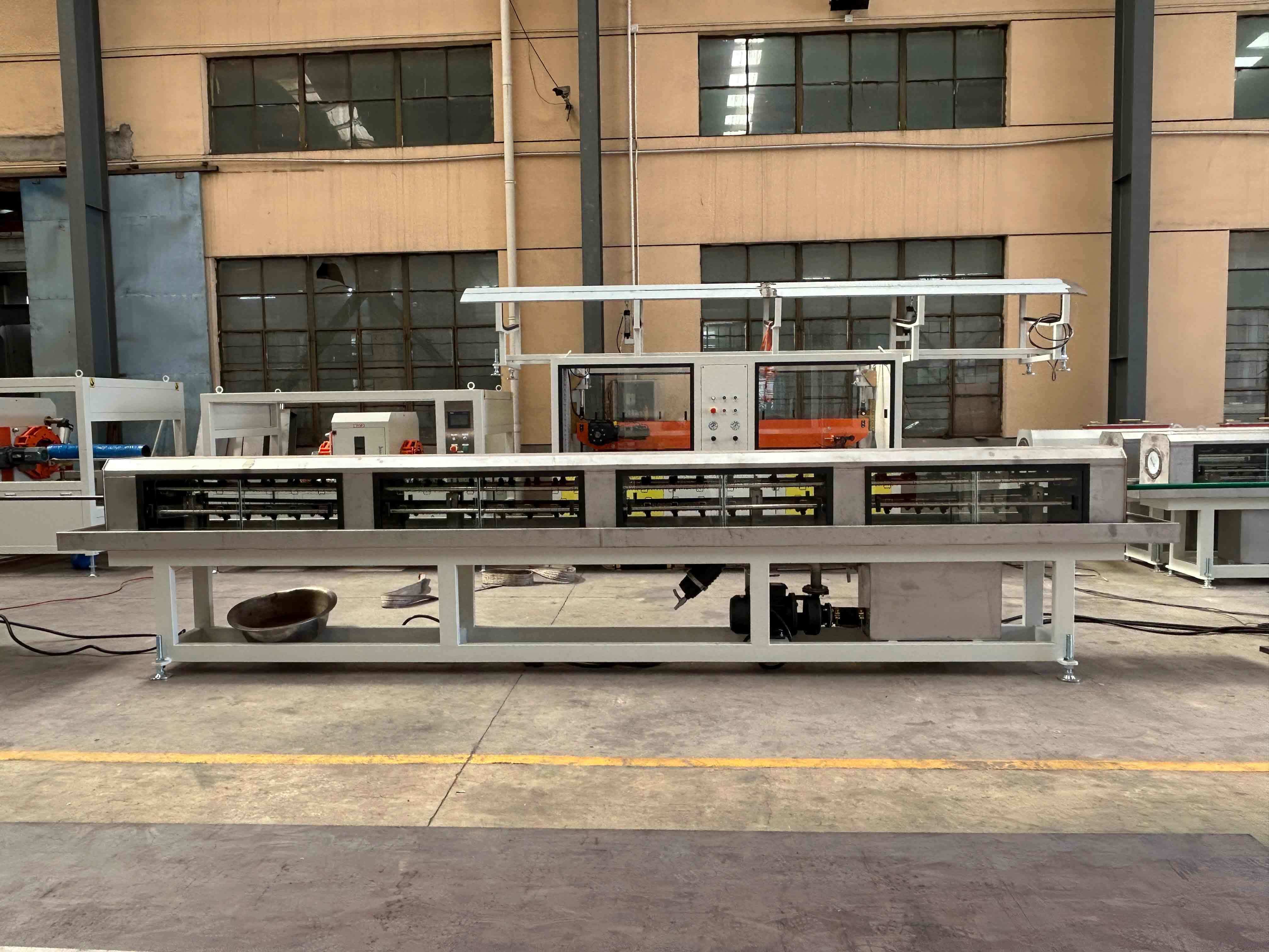 Het gesmolten plastic gaat door een matrijskop om buizen/profielen te vormen en komt vervolgens in een vacuümkalibratietank voor precieze dimensionering en koeling.
