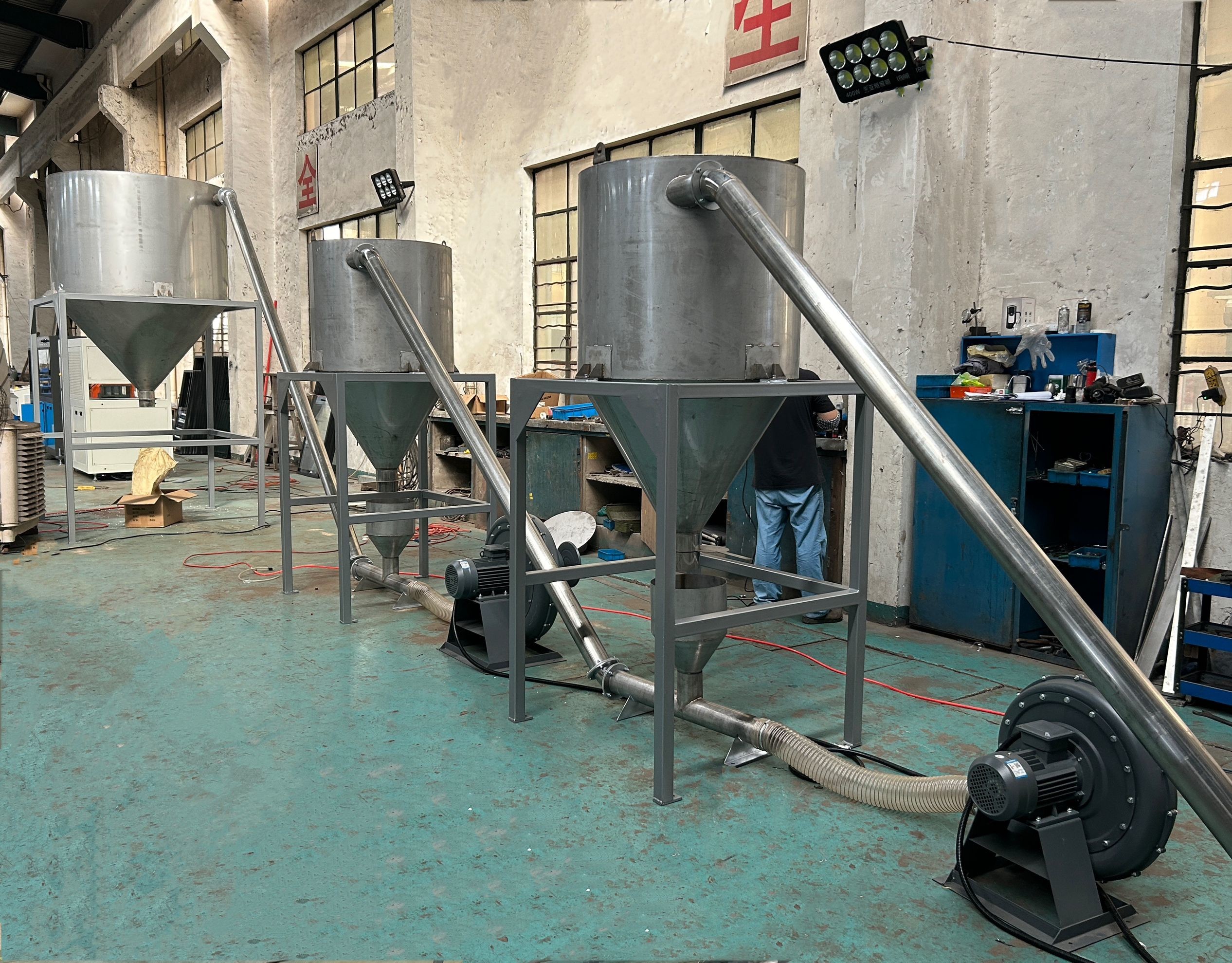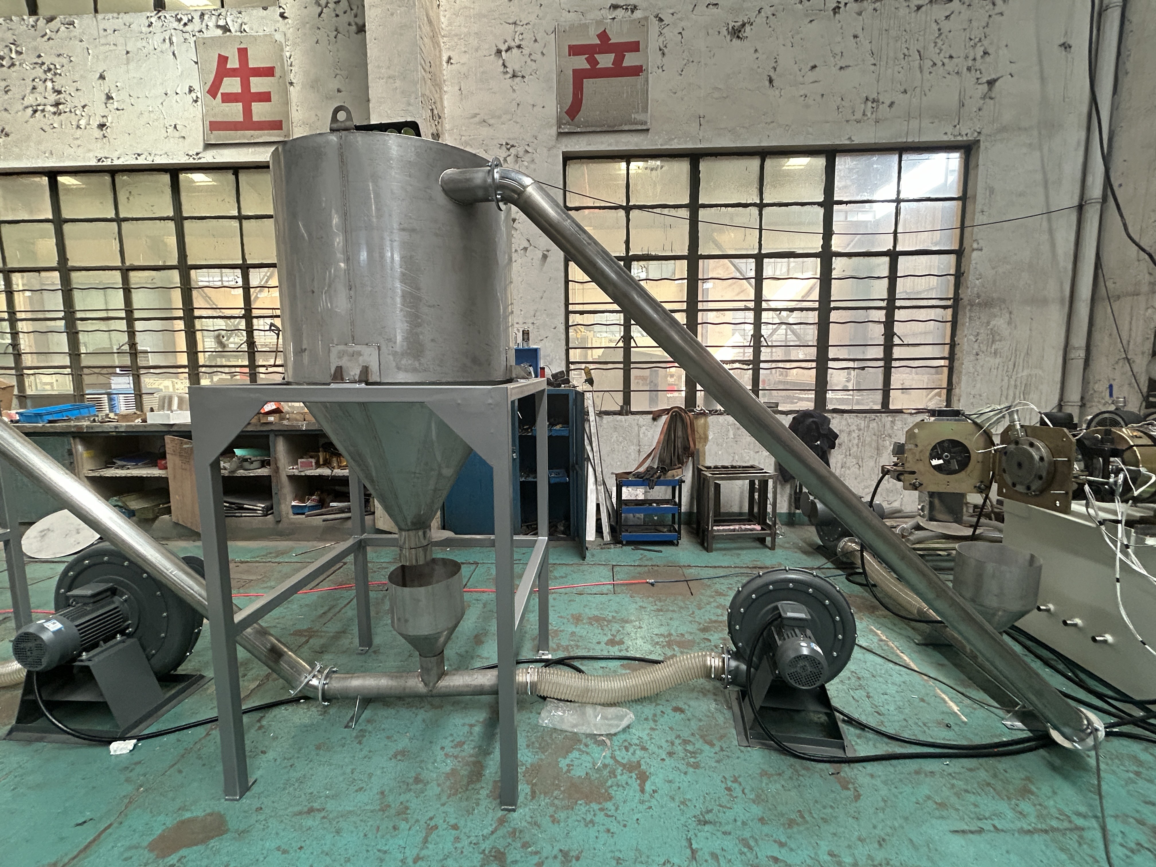 Raw material+ additive → Mixing → Conveying feeding → hopper feeding → Conical twin screw extruder → Hot face cutting → Cyclone separator → Vibration sieve → Blowing system → Storage hopper → Finished product packing