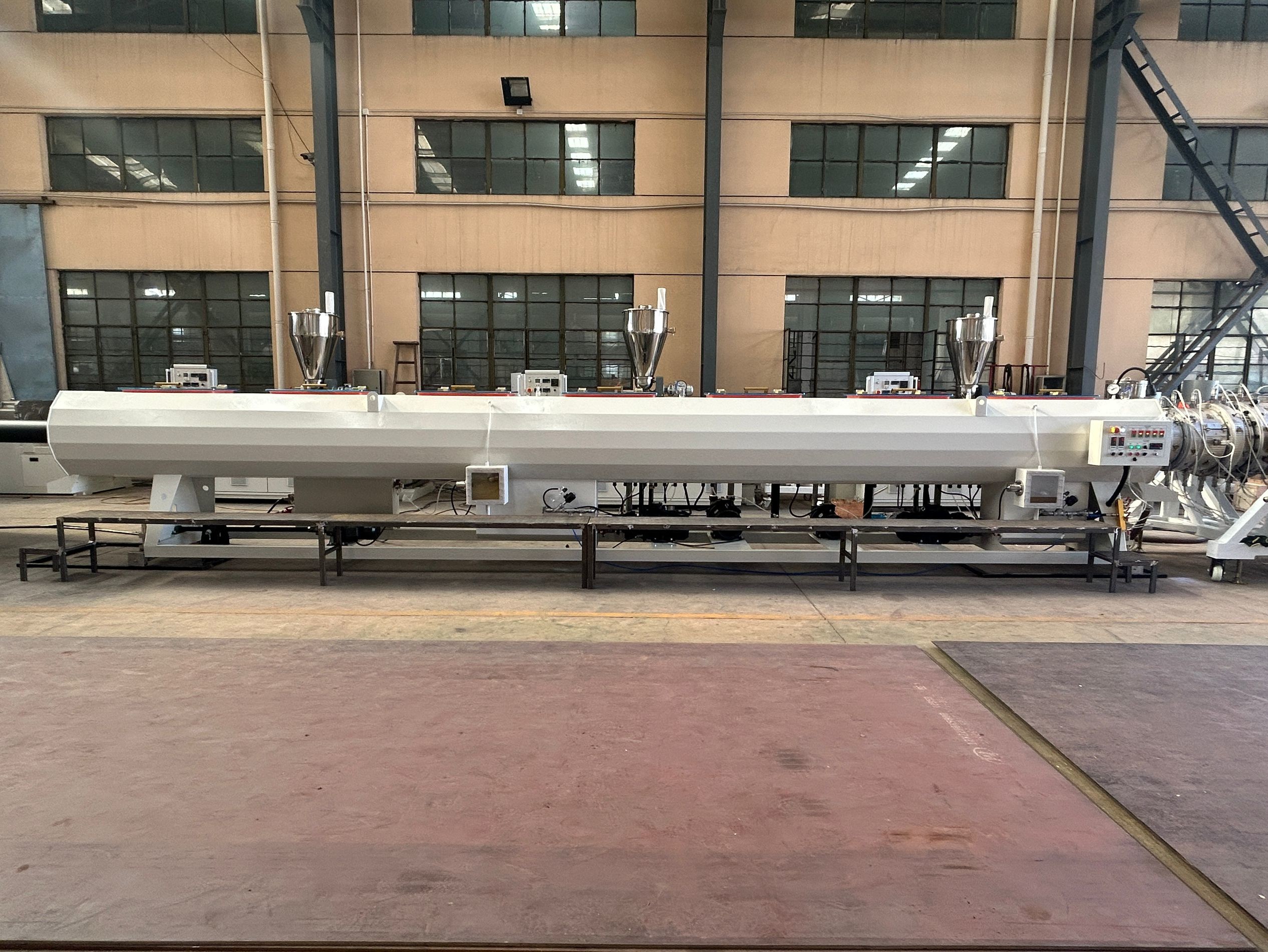 Een pijpafhaalmachine trekt het nieuwe buisje uit de extruder door de vacuüm- en koeltank.