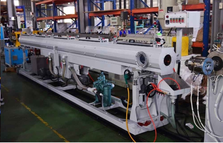 Een pijpafhaalmachine trekt het nieuwe buisje uit de extruder door de vacuüm- en koeltank.