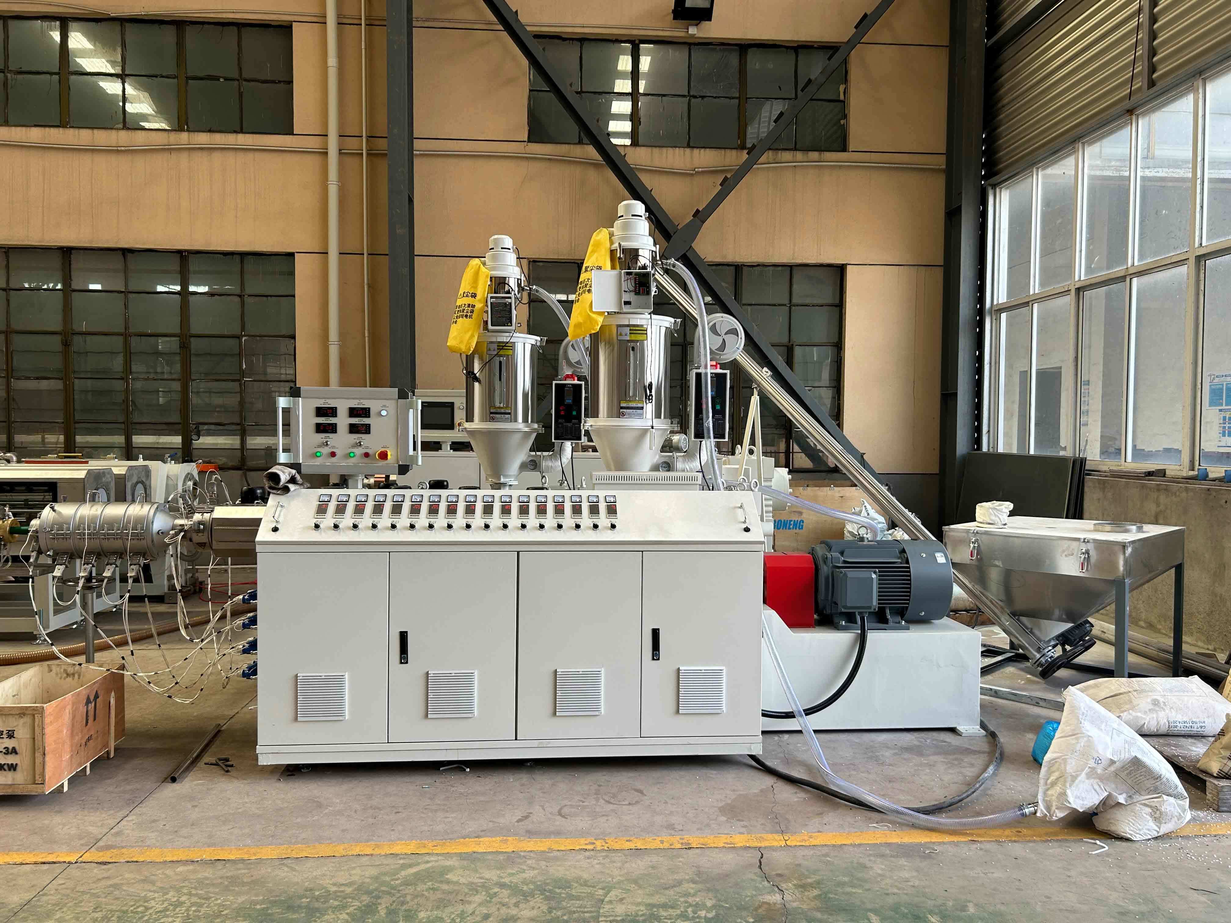 Laadmachine → Droogmachine → Eénschroefextruder→ Vorm→ Vacuüm- en spuitkoelingstank →Afschieten → Snijmachine/Winder → Pijpstacker