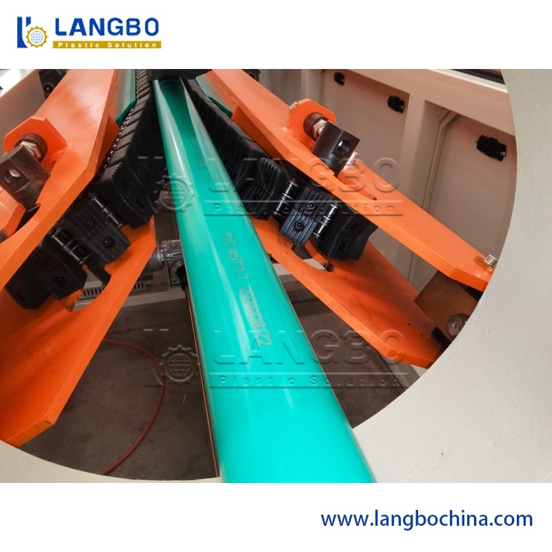 Uitgerust met drie rupsbanden, zorgt de afvoer machine voor een stabiele beweging van geproduceerde buizen. Door de algemene besturing aan te passen, kan deze worden aangepast aan specifieke productievereisten.